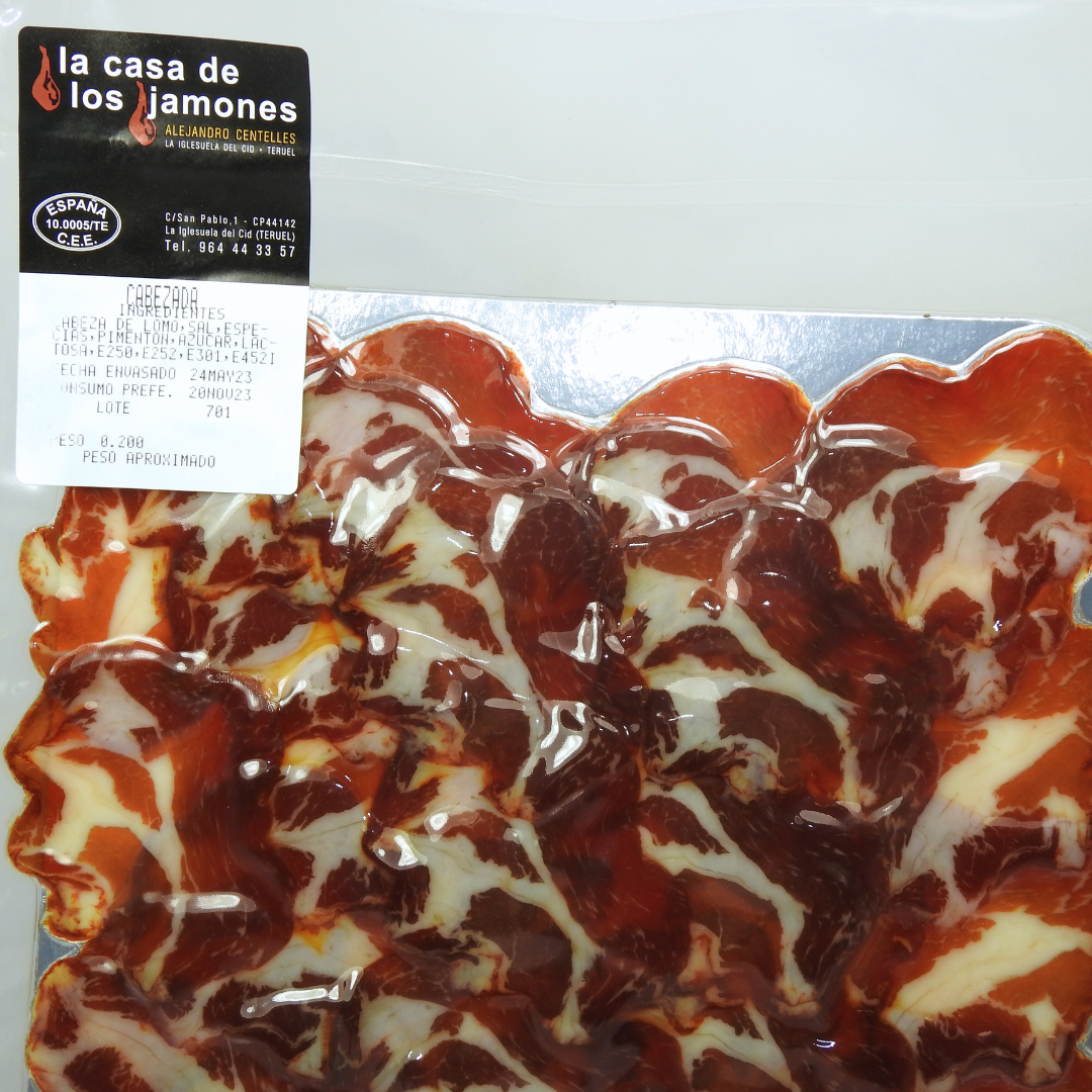 Pieza fileteado de cabeza de lomo embuchado y curado. Producto elaborado adobando y embutiendo en tripa la cabeza de lomo del cerdo, sometiéndolo a un proceso de maduración, lo que le aporta un sabor intenso y una textura fina y suave, a la vez que jugosa, debido a la grasa infiltrada. Apto para celiacos. Peso de 200 g. Se recomienda conservar refrigerado a su recepción. Aconsejamos sacar el producto de su envase y mantenerlo a Tª ambiente antes de su consumo para disfrutar al máximo de su sabor y aroma. El producto se presenta envasado al vacío para una mejor conservación.