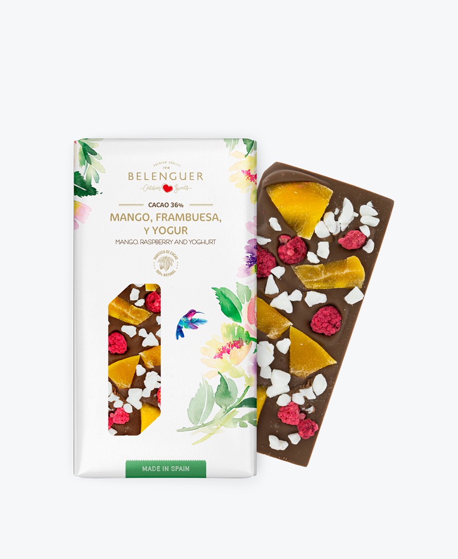 • Ingredientes: Chocolate con leche (79%) (min 36%) (azúcar , manteca de cacao, leche desnatada en polvo, pasta de cacao, lacto suero en polvo, materia grasa láctea, leche en polvo, materia grasa anhidra, emulgente, lecitina de soja, aroma natural de vainilla), mango deshidratado (17%) (Mango, azúcar, acidulante E330, conservante E223), Frambuesa liofilizada (3%) y yogur crunch (2%) (leche desnatada, azúcar, maltodextrina, almidón y ácido cítrico E330).