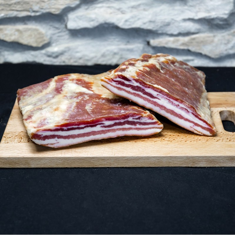 • Panceta de cerdo fileteada, elaborada de forma artesanal y curada de forma natural en nuestros secaderos situados a 1227m sobre el nivel del mar en La Iglesuela del Cid, provincia de Teruel. Único ingrediente para su elaboración: sal marina. Las materias primas seleccionadas junto con el proceso de elaboración artesanal, aportan un sabor, textura y aroma inconfundibles. Igualmente deliciosa para ser cocinada a la plancha o en guisos, así como para comerla al natural, sin preparación. Apto para celiacos y sin lactosa. Peso de la pieza es de 200 g. Aconsejamos sacar el producto de su envase y mantenerlo a Tª ambiente aproximadamente 1 hora antes de su consumo para disfrutar al máximo de su sabor y aroma. El producto se presenta envasado al vacío para una mejor conservación.