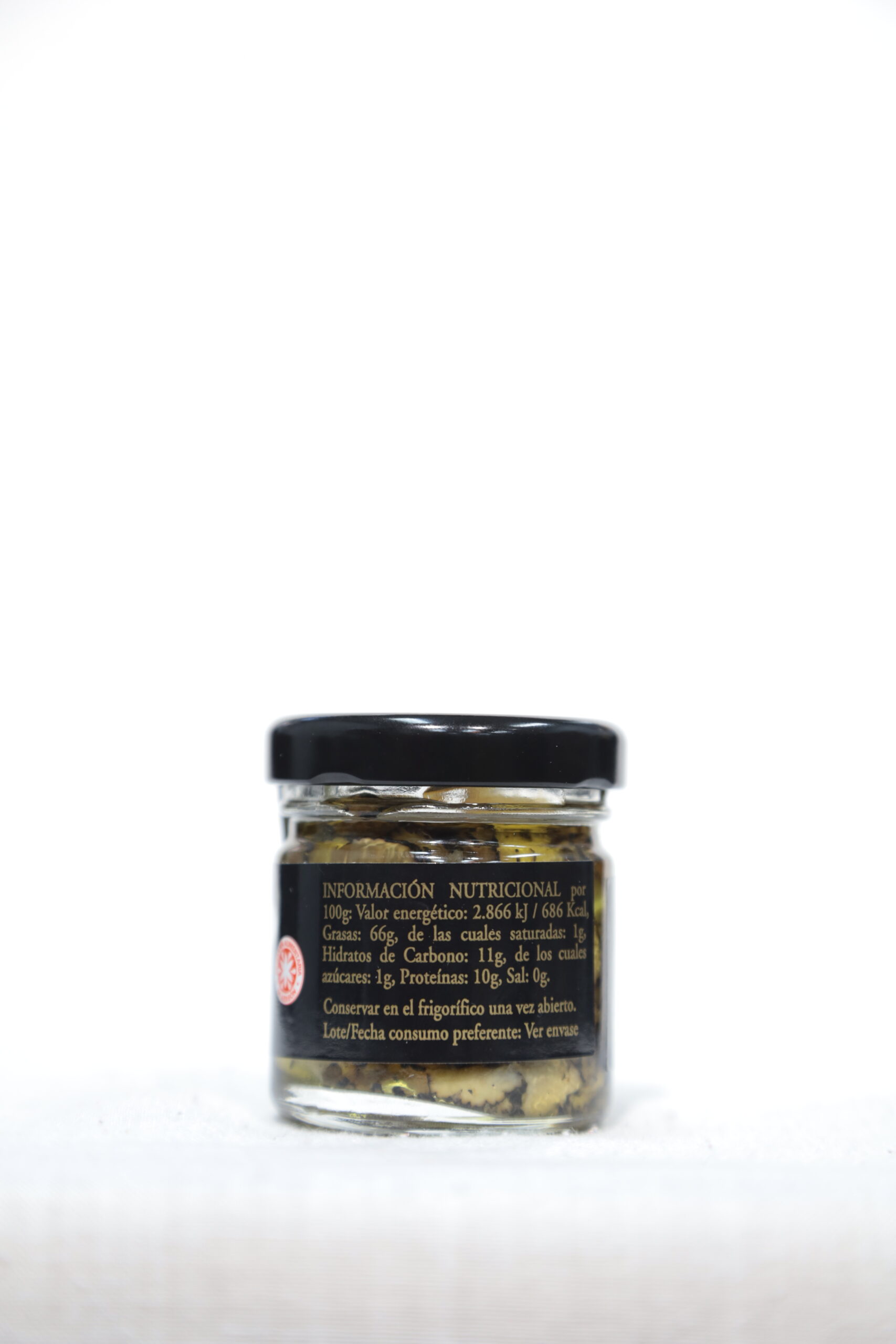 Son trufas de verano  que han sido seleccionadas minuciosamente . Se  laminan manualmente, se colocan en el botecito y se les añade aceite de olivas DO bajo Aragón, así se conservan de las forma mas natural, el aceite nos permite disfrutar de todo su aroma y sabor.